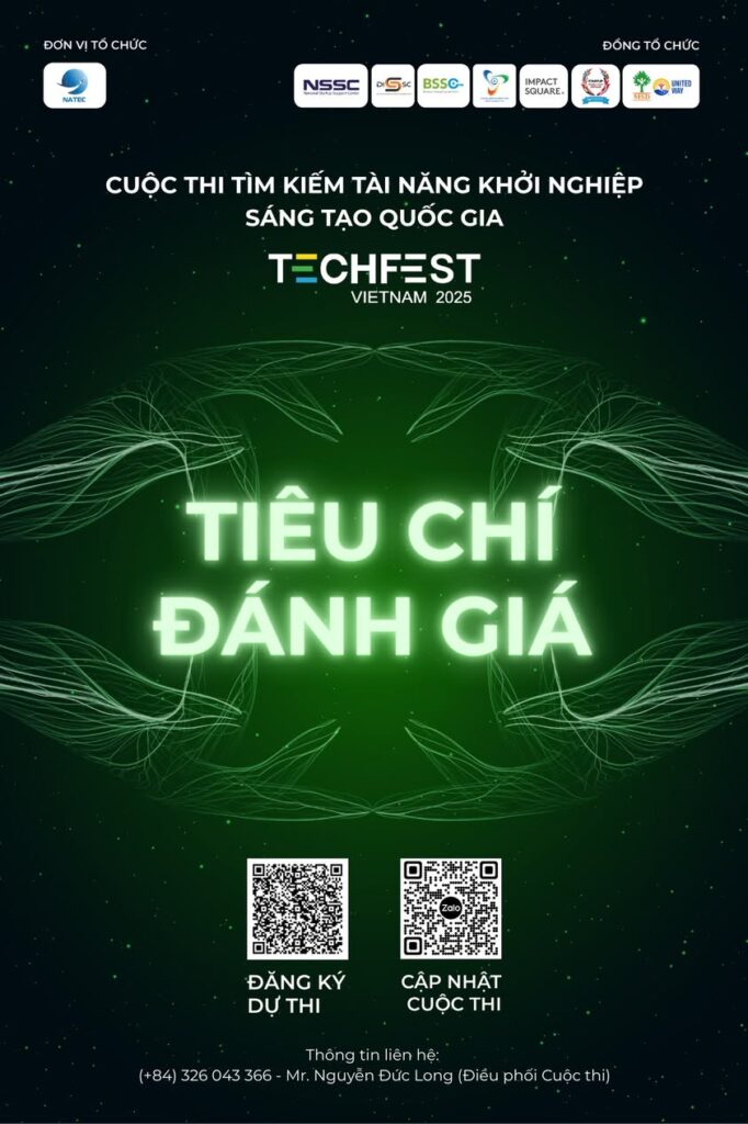 🔟 Thuyết trình: Phần thuyết trình của công ty rõ ràng, truyền tải đủ và đúng thông tin. 🌿 Đặc biệt, các startup trong lĩnh vực xanh & chuyển đổi số với mô hình có khả năng góp phần vào mục tiêu phát triển bền vững (SDGs), chuyển đổi số ngành/nghề, địa phương sẽ có lợi thế cạnh tranh lớn. ✨ Với quy trình minh bạch, chuyên nghiệp và tiêu chí đánh giá toàn diện, Cuộc thi TECHFEST Việt Nam 2025 hứa hẹn sẽ tìm ra những startup xứng đáng nhất, mở ra cơ hội chinh phục sân chơi toàn cầu.